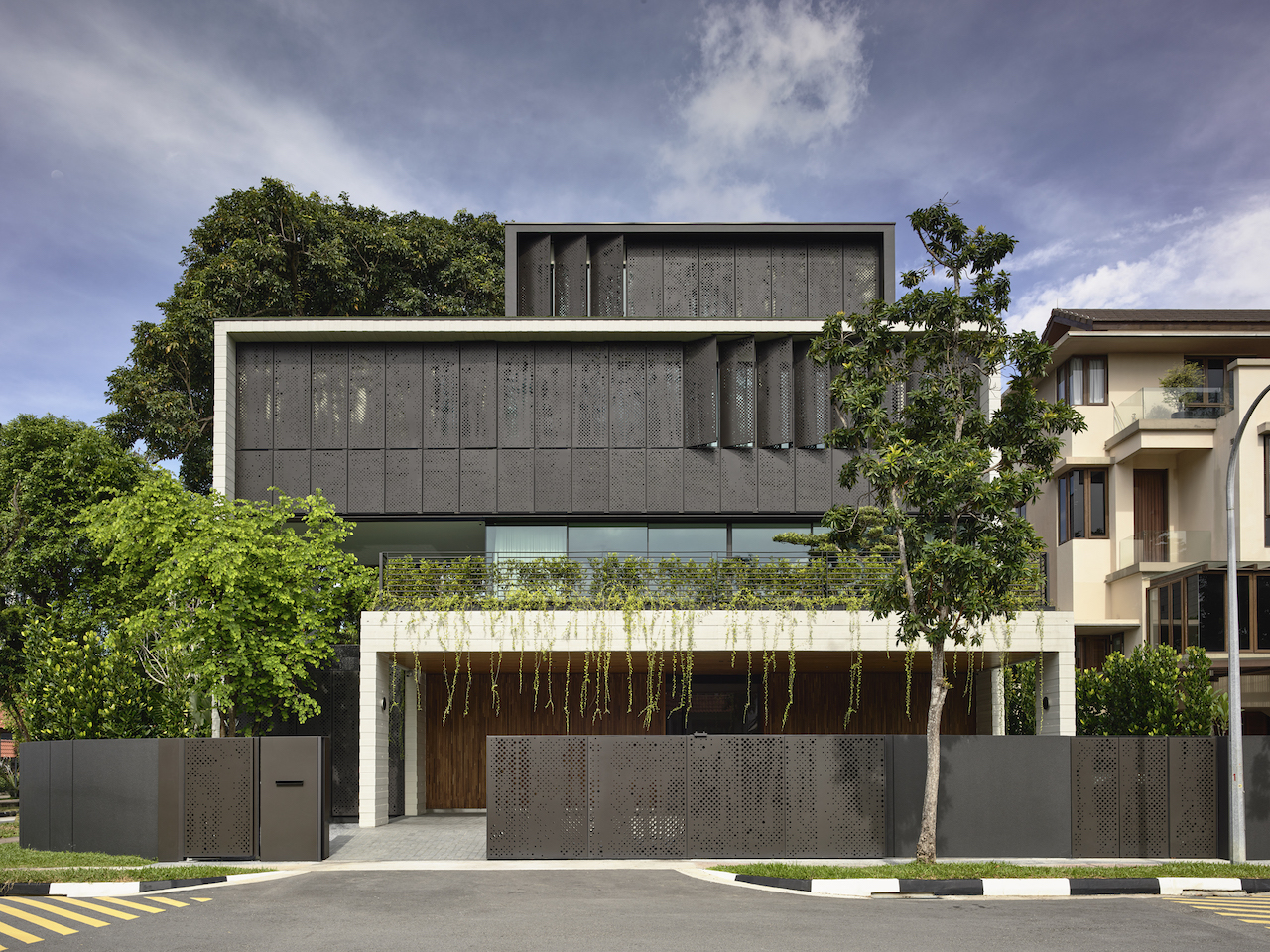 The house has many ecological credentials. “Like most of our projects, the house is designed with passive sustainable solutions, such as cross ventilation on every floor, and with most openings being south facing. The façade that faces west [along the main road] is protected by the screen, and all external aluminium doors-and-window panels are double-glazed, with a low e-coat coating to reduce heat transmission and protect from UV rays coming into the house,” lists Molina, adding that this also insulates well against noise.