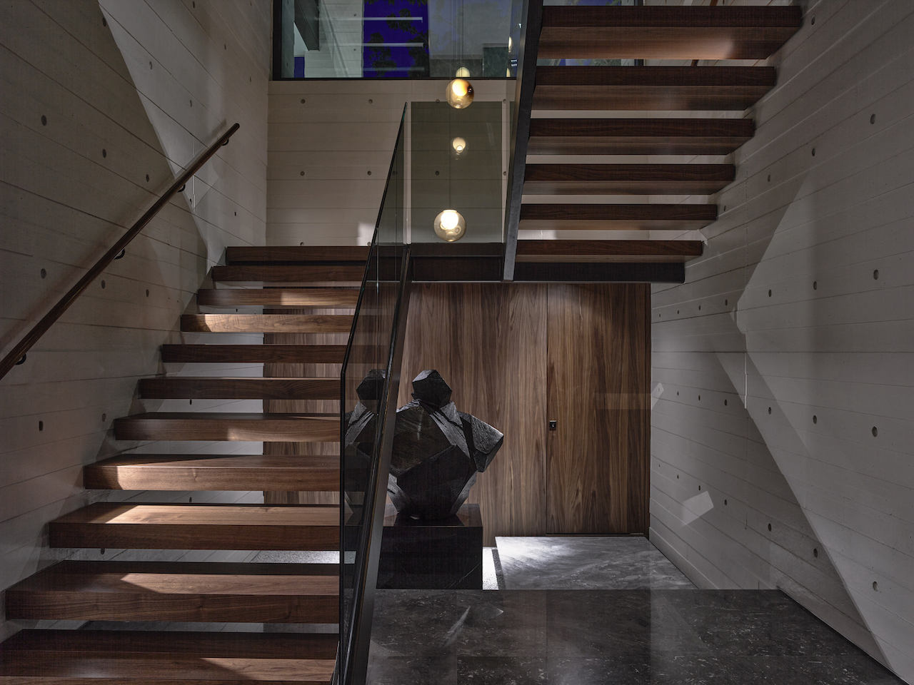 The lift-and-stair core is streamlined at the house’s centre, fronted by a glass façade facing the tree. In the dining room and dry kitchen area that enjoys this vantage point, a dramatic Bocci light pendant cluster floats in the space, catching the light and “accentuating the verticality of the staircase”.