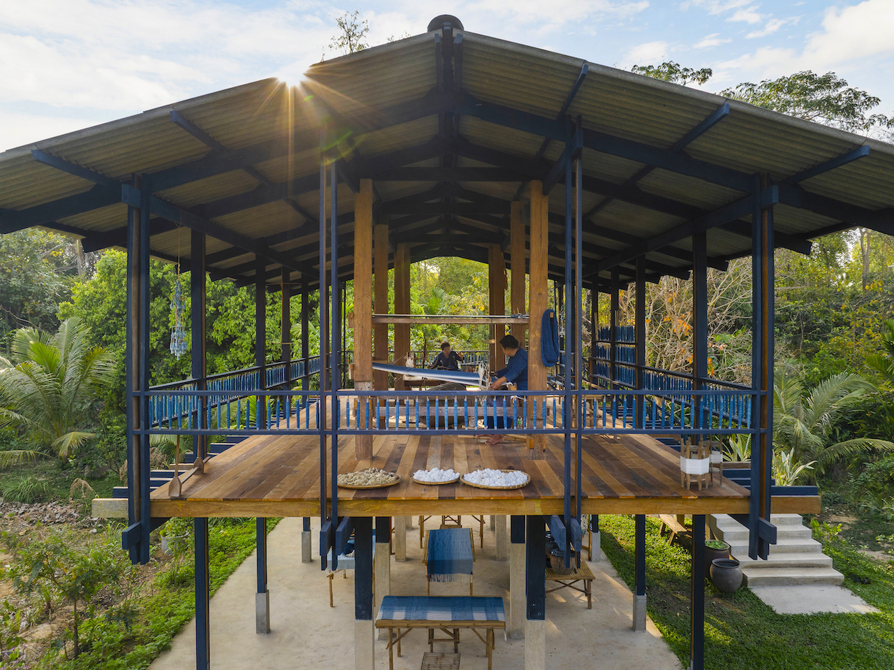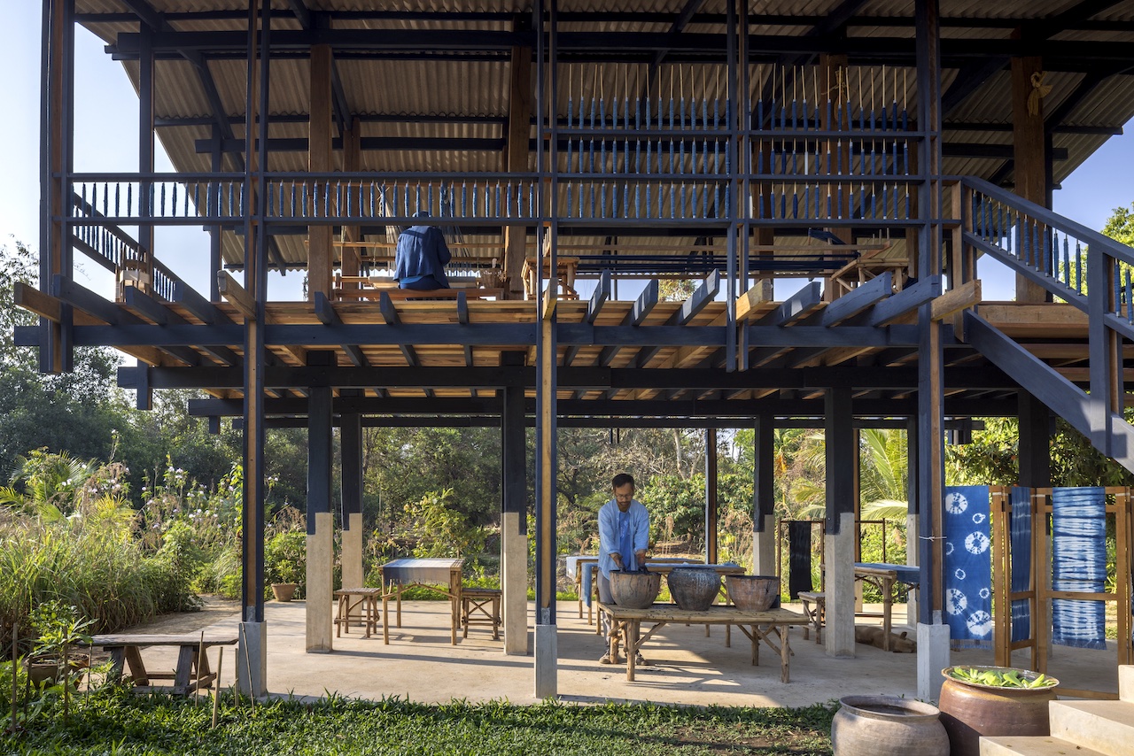 The Indigo Loom House is a pavilion-like timber structure with a pitched roof that advertises its programming through its architecture, such as by dyeing parts of the structure with beautiful indigo paint. “The Indigo Loom House is a ‘bastard’ or crossbreed between the typical Thai wooden house-on-stilts and the textile loom,” explains Chuenrudeemol.