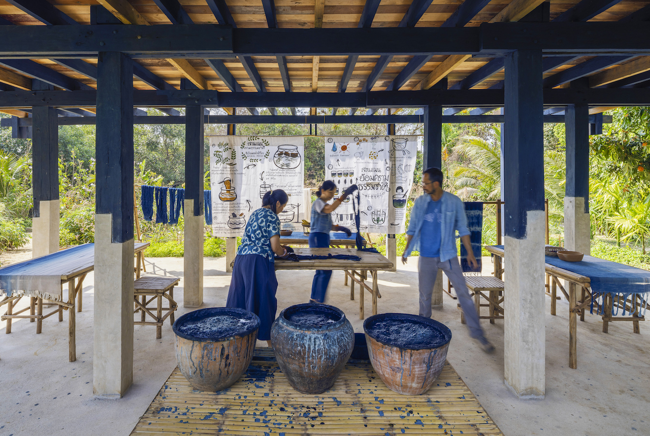 The Creative Crafts Center at Man Gardens is an inspiring place in Thailand’s Sakon Nakhon district. Its owner is Prach ‘Mann’ Niyomkar, an indigo textile artist from Sakon Nakhon who works with local weaving ‘aunties’ to both produce indigo and the naturally coloured textiles. His brand, Mann Crafts, is one of the region’s leading textile brands. Niyomkar’s nickname means ‘yes’ in the Issan language while Man Gardens’ name means ‘mankind’ or ‘humanity’ in the language, which he wanted Man Gardens to symbolise.