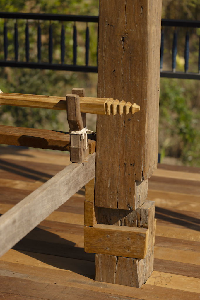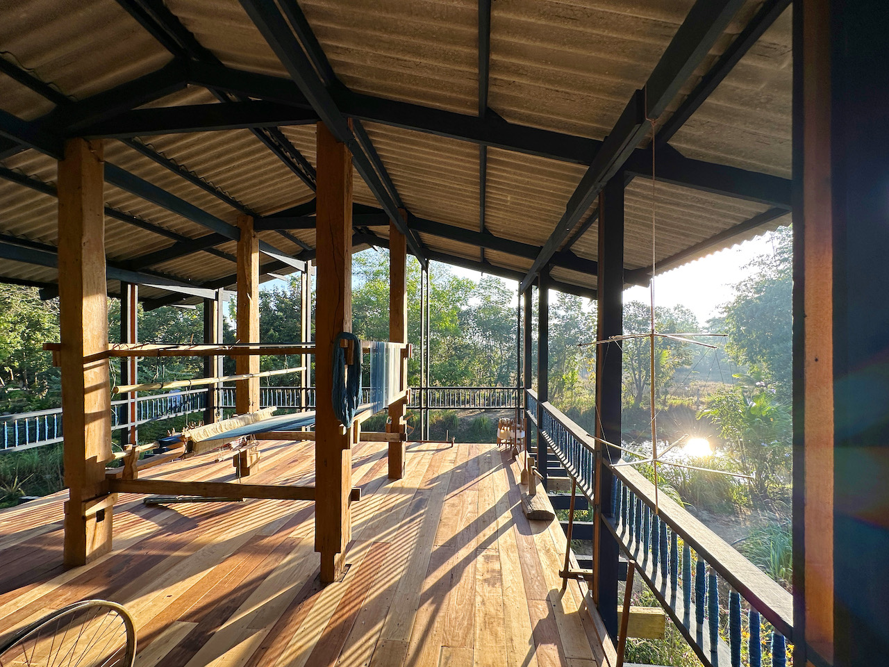 Chuenrudeemol mentions, “The sizing of weaving looms, warping frames, threaded spools and spinning wheels all determine the proportions of the architecture, just as much as the proportions of the columns and beams [that were taken from] a salvaged house.”