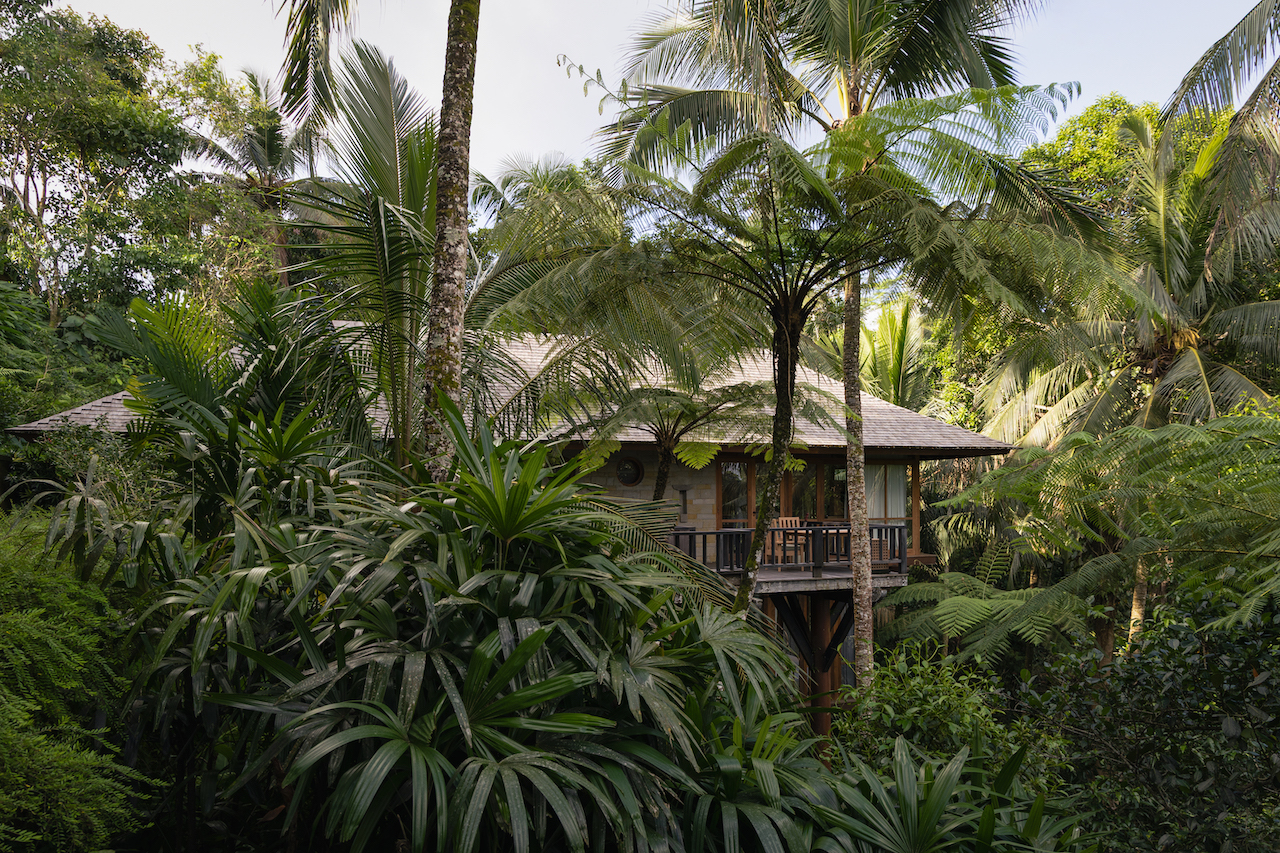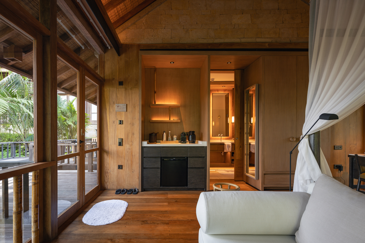 Teak floors and ironwood shingle roofs establish the atmosphere of a refined five-star treehouse, while flowing white drapes are paired with classic Balinese furniture and traditional accents, allowing the architecture to harmonise naturally with its environment and cultural context.