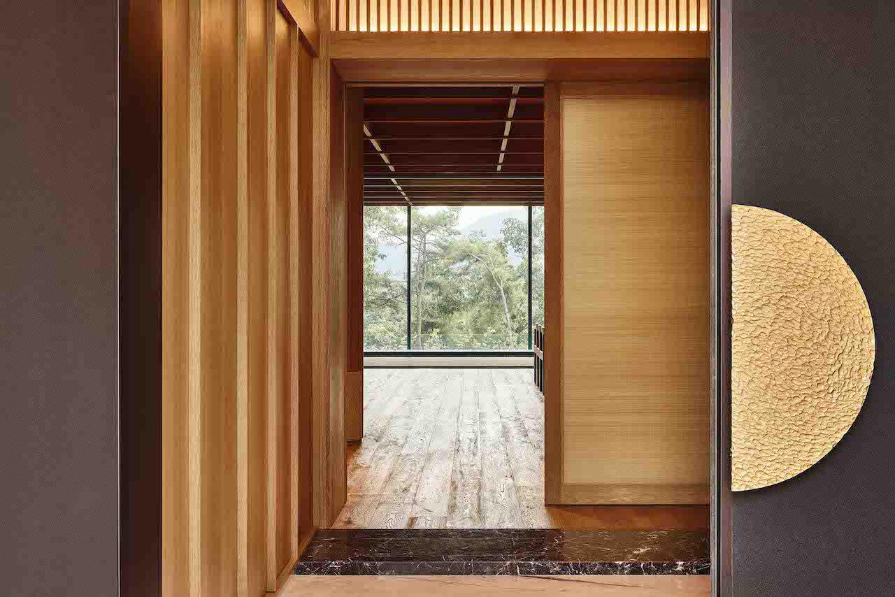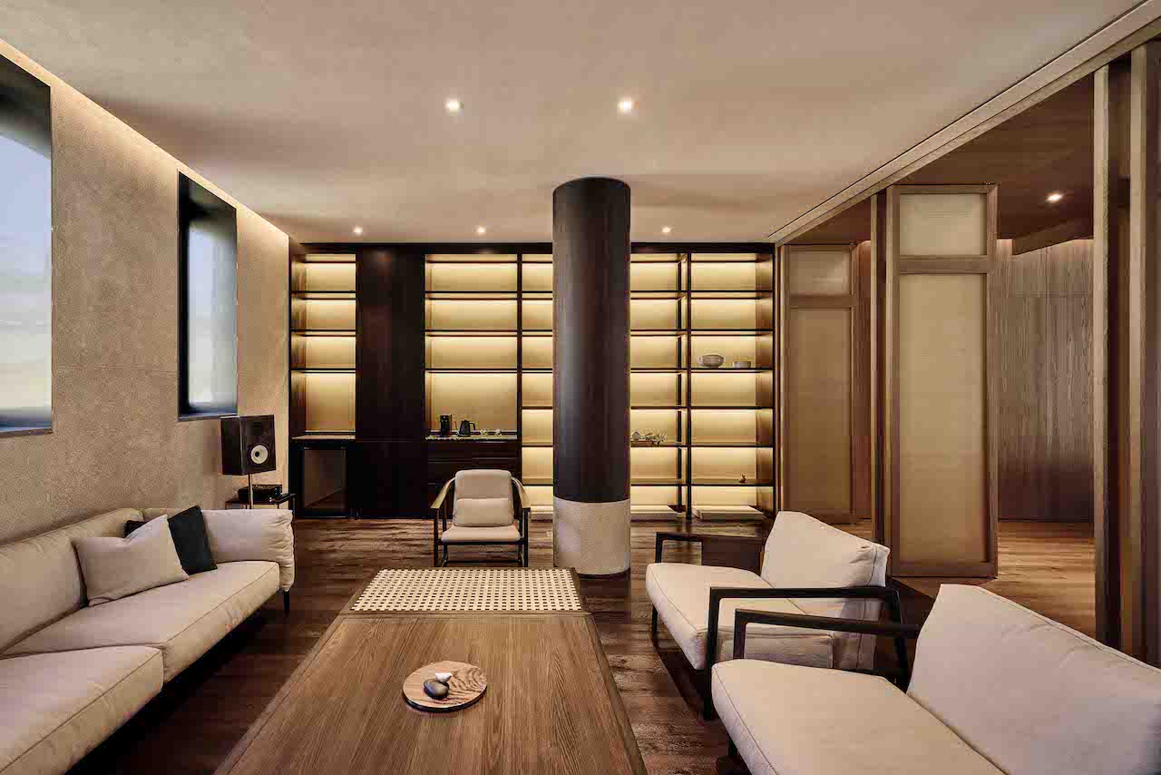 The upper level houses two independent guestrooms flanking a central lounge. This layout maximises privacy while ensuring smooth circulation. Each room includes a separate living area, minibar, and hinoki bathtub, creating a private and luxurious lodging experience through thoughtful amenities and design details.
