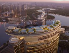 Each tower consists of four wings of stepped-back terraces that converge towards the top, encircling an outdoor tropical atrium.